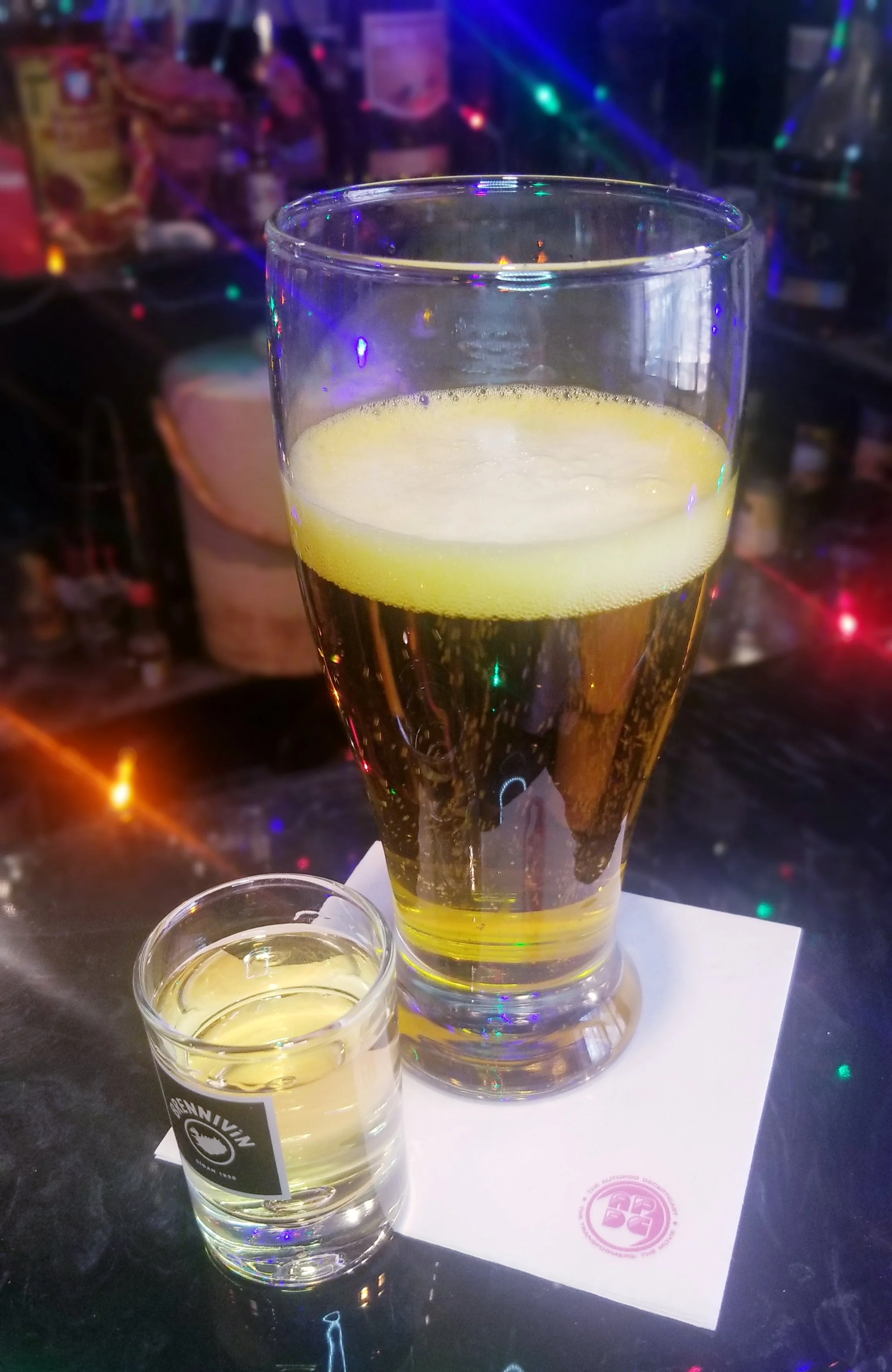This is a type of Boilermaker drink. In America, there are two types of Boilermakers, and it traces its origins back to miners in Butte, Montana, in the 1890s. It’s a shot of whiskey and a pint of beer. One method is to shoot the whiskey and chase it with beer, which you then drink normally. The other is to mix the two by dropping the shot into the beer, which is the method Bryan outlines here. But instead of whiskey, we have: